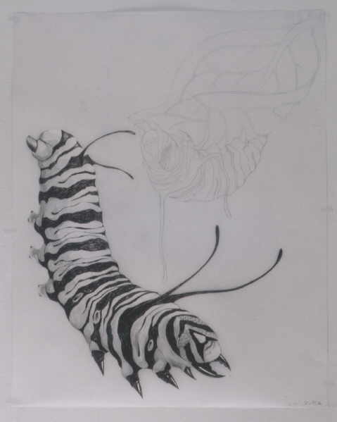Insectoid Larvae is painted and drawn on translucent vellum paper: which looks greyish in photos. It was created by Debbie O'Rourke as a study for the monumental installation Milkweed Patch. It cannot be reproduced except by permission of the artist. |