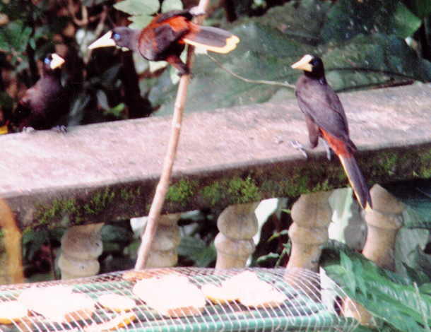 At the table feeders, a great flock of goofy oropendolas, also called yellow-tails or cornbirds, clowned gregariously.