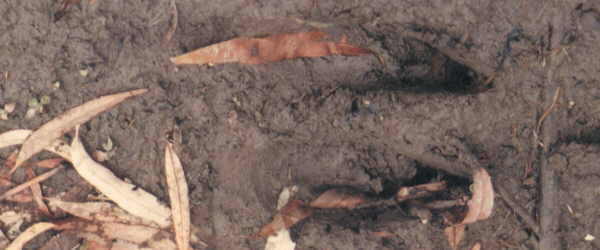 As I followed the raccoon tracks along the edge of the mud flat, they were joined by this hoofprint. The tracks are quite large, about this size. Soon they got very deep and churned, as though the animal was running. |